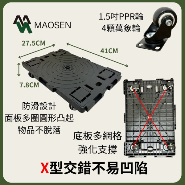 首頁 便利推車系列 平面板車烏龜車 MAOSEN 茂森生活工廠 拼接迷你龜1.5吋4萬象輪 100KG 居家必用品 MAOSEN 茂森生活工廠 拼接迷你龜1.5吋4萬象輪 100KG 居家必用品NT$190.00 可拼接 載重100KG 四面皆可拼 MAOSEN 茂森生活工廠 拼接迷你龜1.5吋4萬象輪 100KG 居家必用品 數量 立即購買 加入購物車 分類: 平面板車烏龜車 描述 描述 可拼接平板車 迷你烏龜車 https://maosenlife.com/wp-content/uploads/2026/01/迷你烏龜車.mp4 相關商品 MIT 平面煞車烏龜車 3吋輪 雙鋼條強化款300KG 四輪活動輪 塑鋼車 工業板車 平面烏龜車 🔍加強烏龜車 NT$980.00 加入購物車 [茂森🌲生活工廠]MIT 平面烏龜車 3吋輪 雙鋼條強化款300KG 四輪活動輪 塑鋼車 工業板車 平面烏龜車 🔍加強烏龜車 NT$920.00 加入購物車 拼接烏龜車 無限延伸 高載重無限拼接 輕巧便利好收納 平面烏龜車 平板車 NT$270.00 加入購物車 [茂森🌲生活工廠]MIT 三邊烏龜車 200kg 3吋輪四輪活動輪 塑鋼車 工業板車 🔍三邊烏龜車 NT$820.00 加入購物車